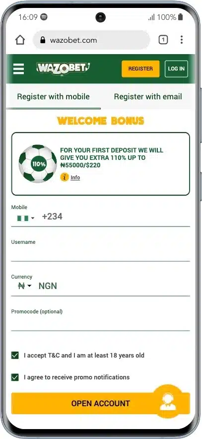 - Choose to either register with a mobile number or email. Fill out the Wazobia registration form by entering your mobile number or email address, and currency. In addition, enter the Wazobet bonus code 2025 if one is available. Click “Open Account” to submit the form.